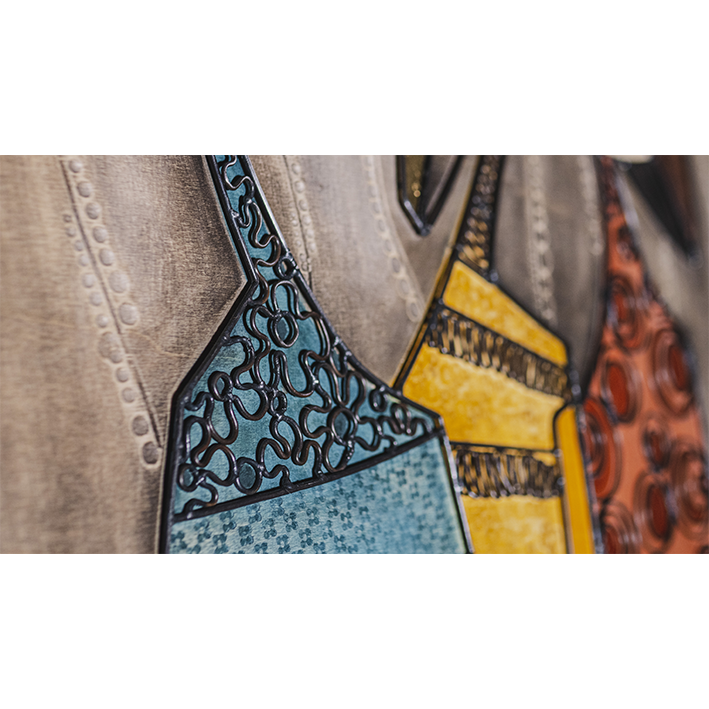 Donne con cappello 2 (81 x 100 cm) TECNICA E MATERIALI: texturizzazione del legno, cesellatura, sbalzo, saldatura ossioacetilenica, ferro, legno, ottone, rame, colori all’anilina. ANNO: 2023
