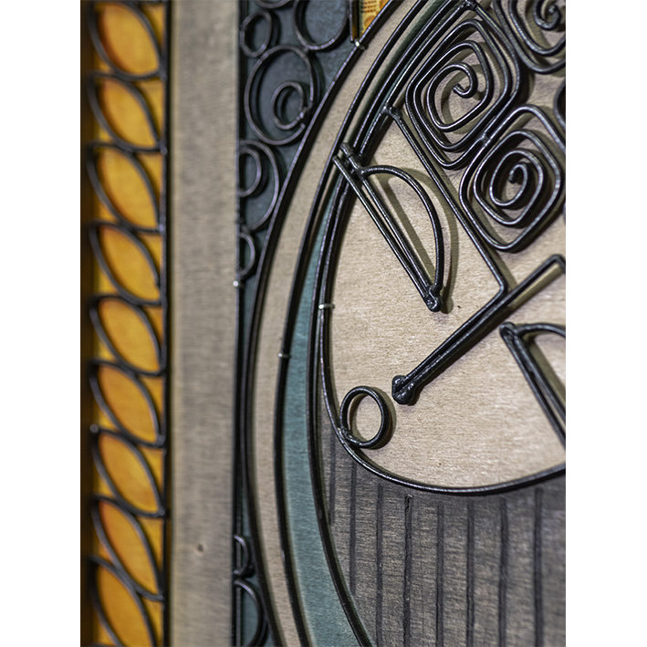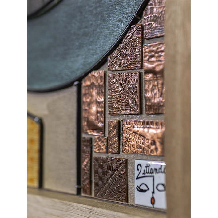 Inizio (50 x 49 cm) TECNICA E MATERIALI: saldatura ossioacetilenica, cesellatura, texturizzazione del legno, ferro, rame, legno, colori all’anilina. ANNO: 2022
